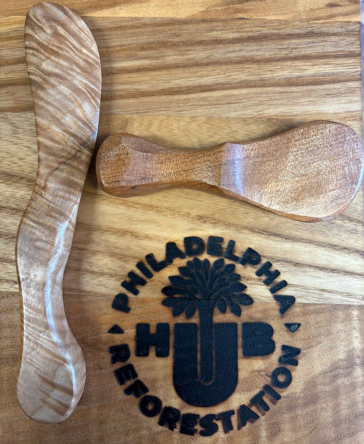 Elevate your table or charcuterie board with this handcrafted two-piece wooden cutlery set, featuring a butter/soft cheese knife and a spreader made from reclaimed hardwoods. Each set is crafted from off-cuts generated during tree stake production at the Philadelphia Reforestation Hub, transforming leftover material into functional, beautiful pieces.
