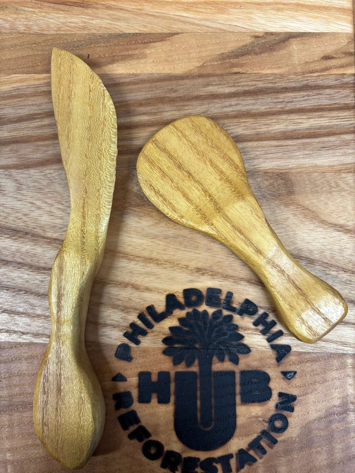 Elevate your table or charcuterie board with this handcrafted two-piece wooden cutlery set, featuring a butter/soft cheese knife and a spreader made from reclaimed hardwoods. Each set is crafted from off-cuts generated during tree stake production at the Philadelphia Reforestation Hub, transforming leftover material into functional, beautiful pieces.