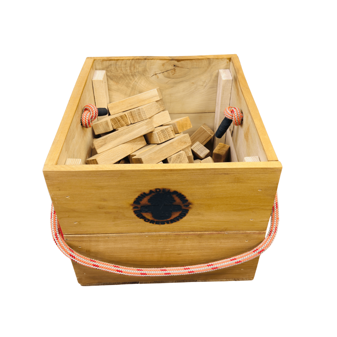 Bring sustainable play to game night with our handcrafted Tumbling Towers set — a Jenga-style stacking game made entirely from the leftover offcuts produced during tree stake manufacturing. This product is literally a byproduct of a byproduct, showcasing the full potential of circular, zero-waste wood reuse at the Philadelphia Reforestation Hub.